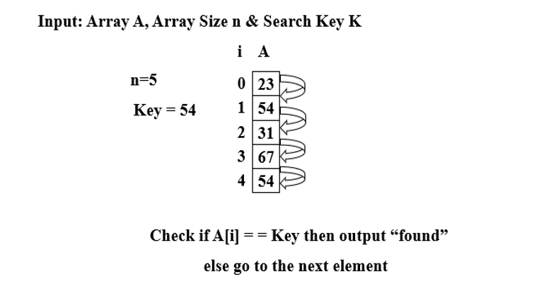 - The searching process starts at the first place and traverses all the elements one after another until the key is found. Otherwise, the searching process continues until the last element.