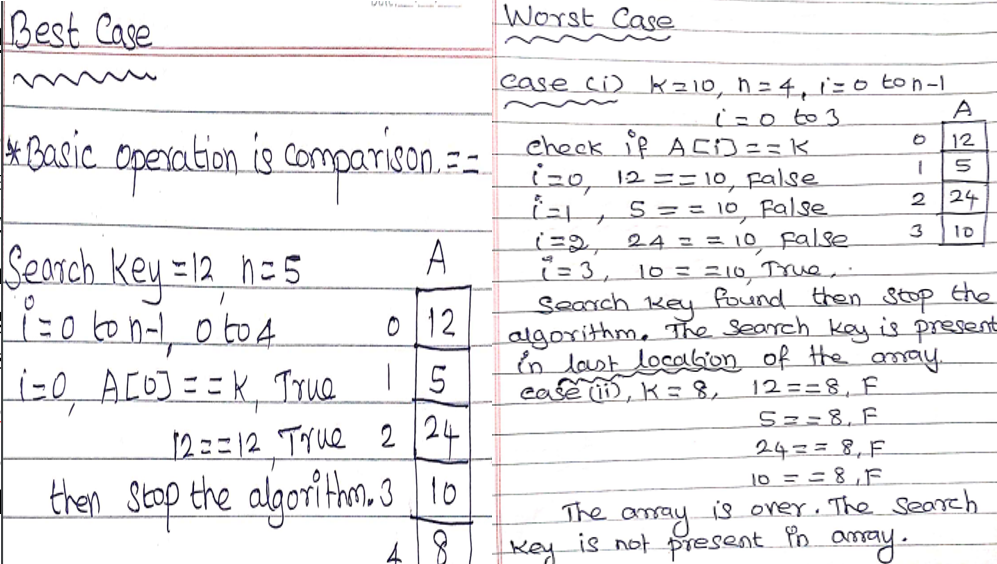 Best Case: If the search key is present in A[0], the linear search algorithm performs only one comparison. Thus, Best(n) = 1, Best(n) = O(1); the order of growth is constant.